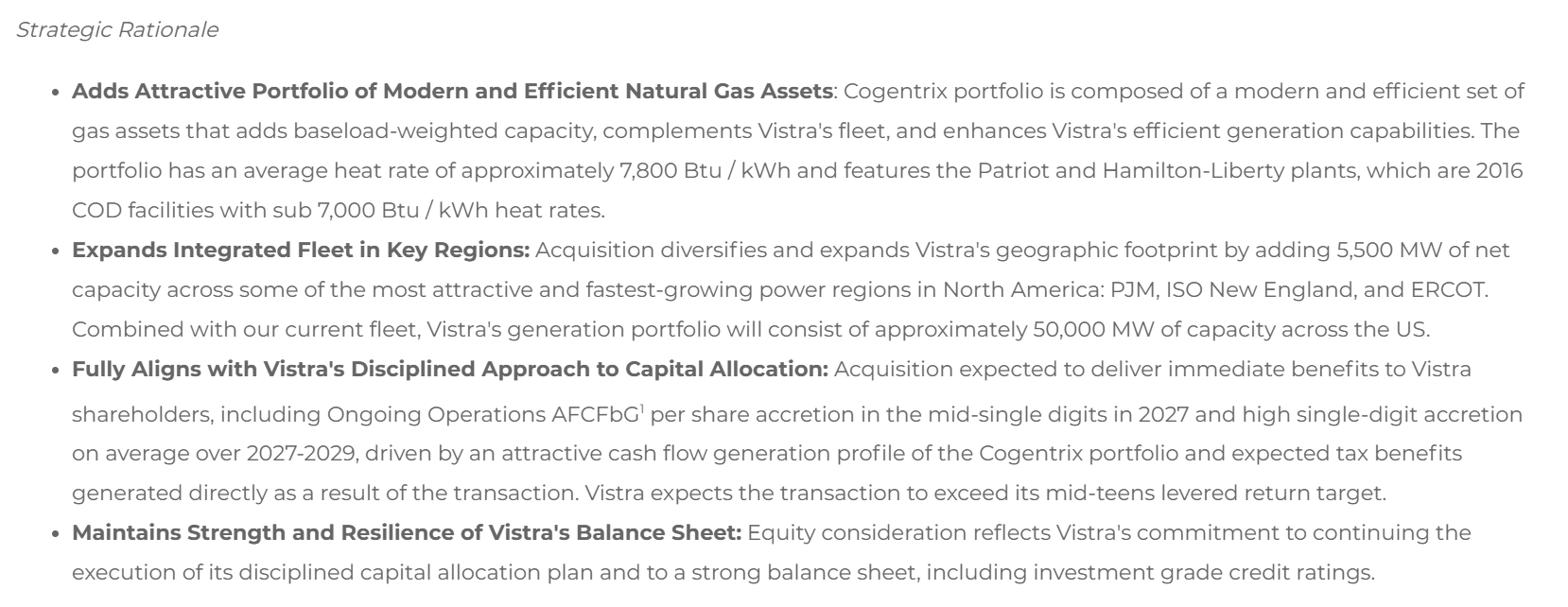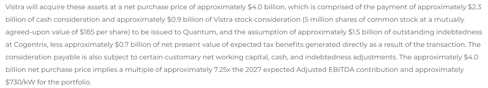 The consideration is: $2.3 billion in cash, $900 million in Vistra stock, and the assumption of $1.5 billion in debt, partially offset by roughly $700 million in tax benefits. The transaction is being struck at ~7.25x EBITDA, which is a pretty reasonable valuation given the demand hype.