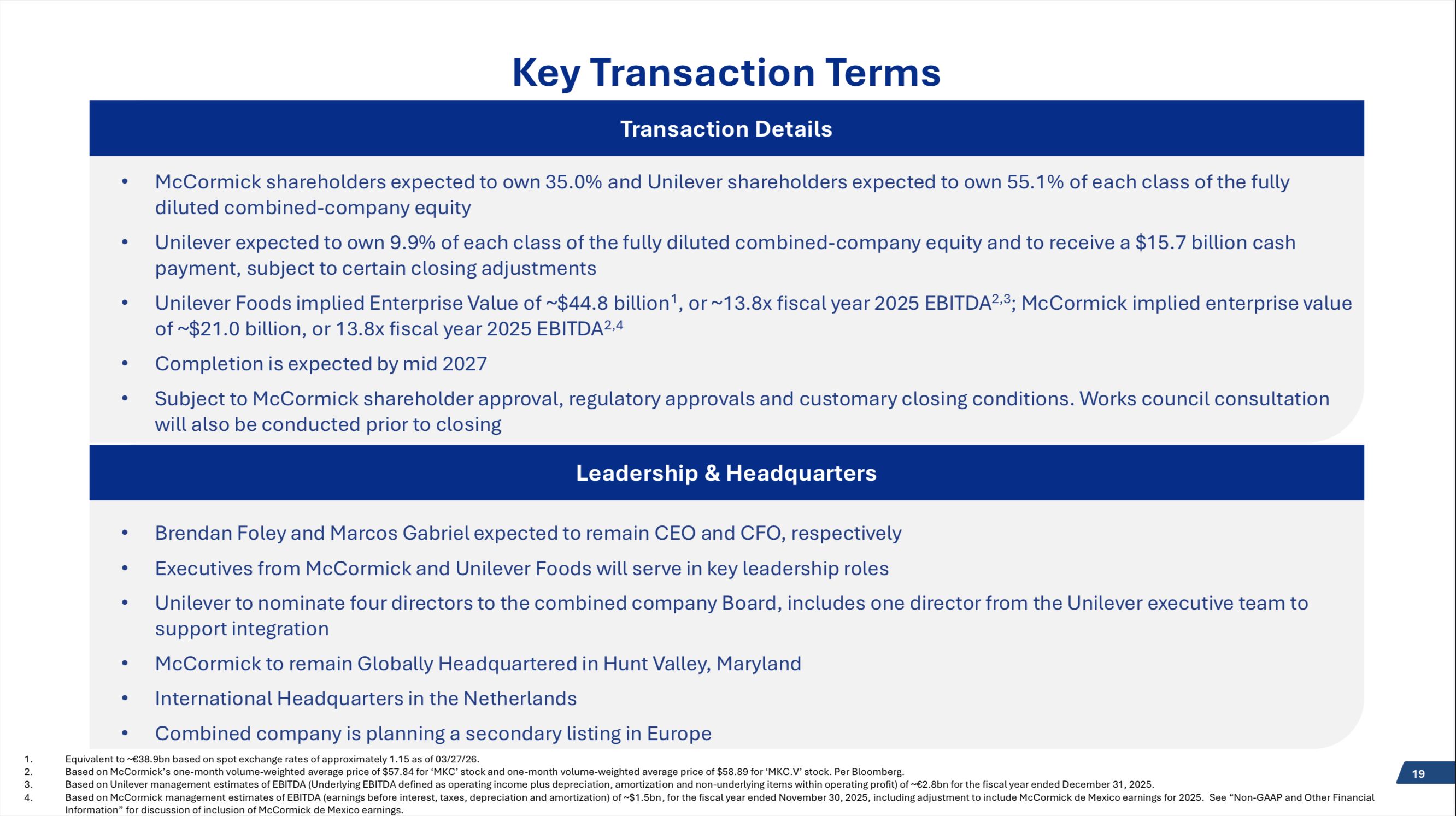 McCormick pays $15.7 billion cash and ~$29 billion in stock; post-close, former Unilever Foods shareholders own roughly two-thirds of the combined company. Citi, Goldman, and Morgan Stanley are all taking a bite out of the bridge financing.