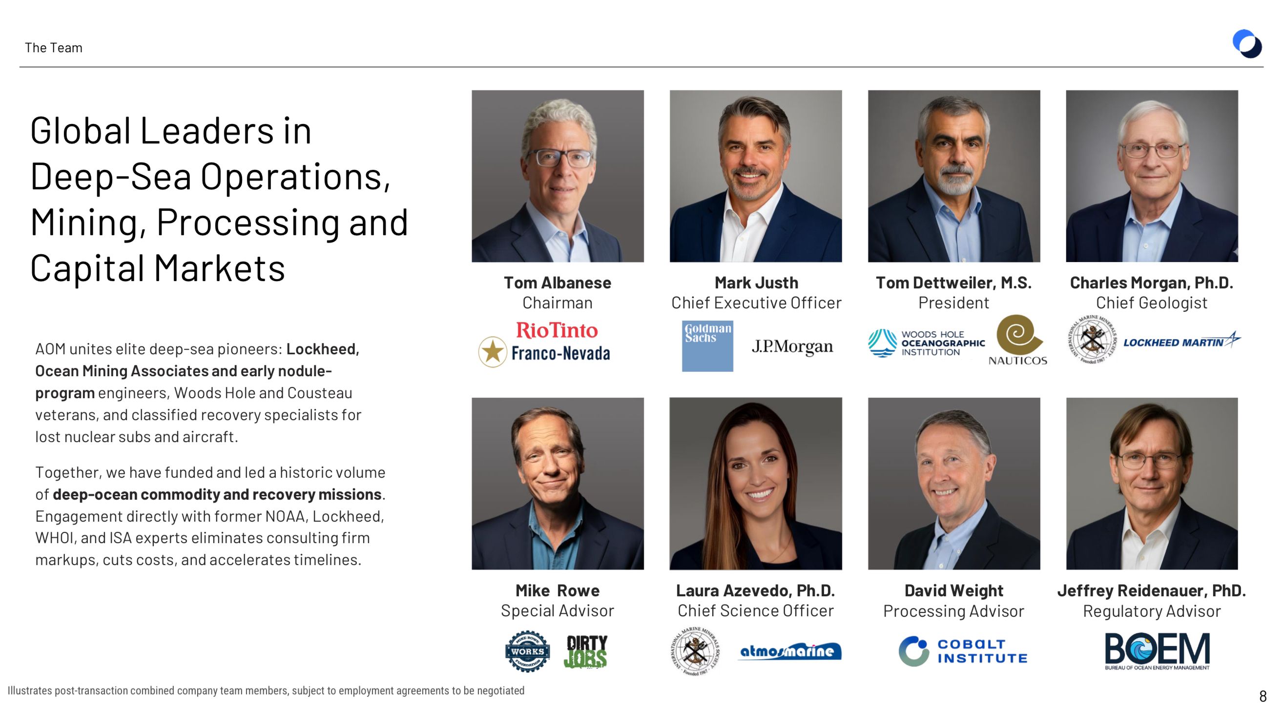 The management team is the actual signal. Chairman is Tom Albanese, ex-CEO of Rio Tinto and Vedanta, the most credible mining executive attached to any deep-sea venture. CEO Mark Justh is a former JPMorgan and Goldman banker who was already Odyssey’s lead independent director, which explains why OMEX became the vehicle. Mike Rowe of Dirty Jobs is a founding investor and brand ambassador, so maybe this company will get its hands dirty.