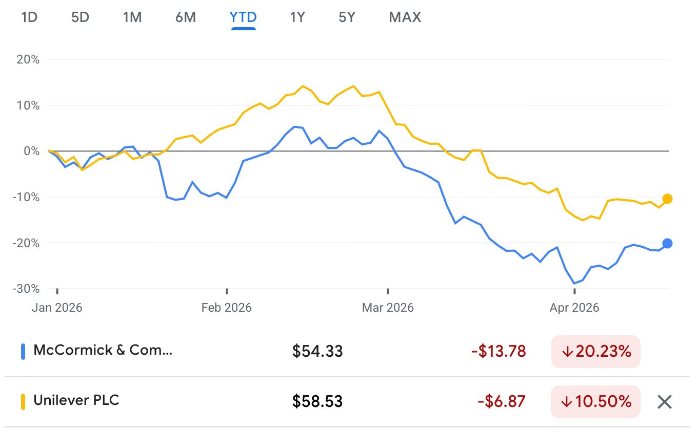 McCormick stock dropped 6% on announcement day, which is the market’s way of saying “we believe you, but we’re nervous.” MKC was already down 26% year-to-date. Unilever also dropped 4%. I guess no one wins on announcement day anymore.