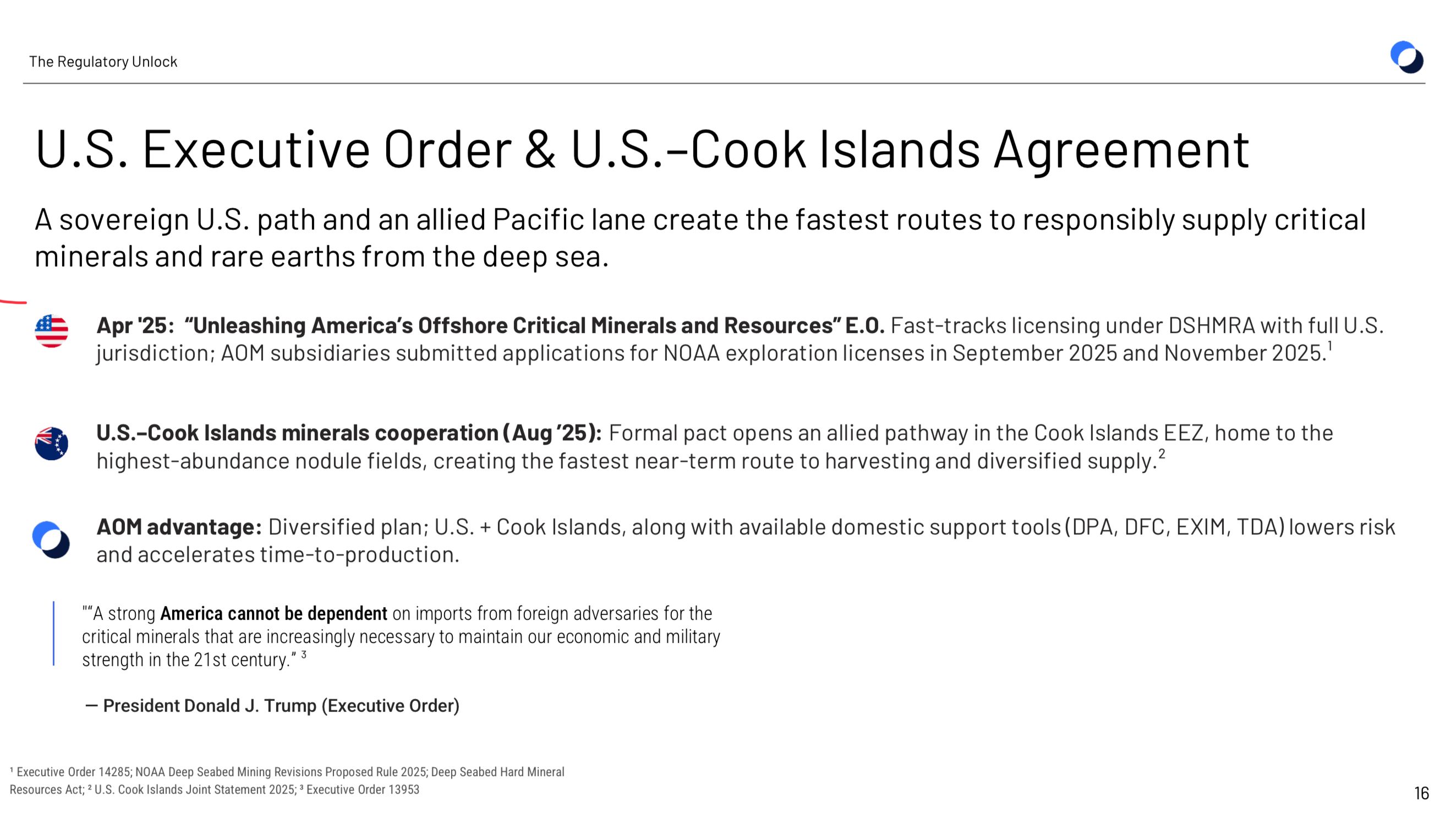 AOM holds licenses across the Cook Islands EEZ and U.S.-regulated CCZ waters, covering 500,000+ km² and more than 1.4 billion tonnes of inferred nodule resource. The bet is that the domestic U.S. permitting track closes before the multilateral one opens.